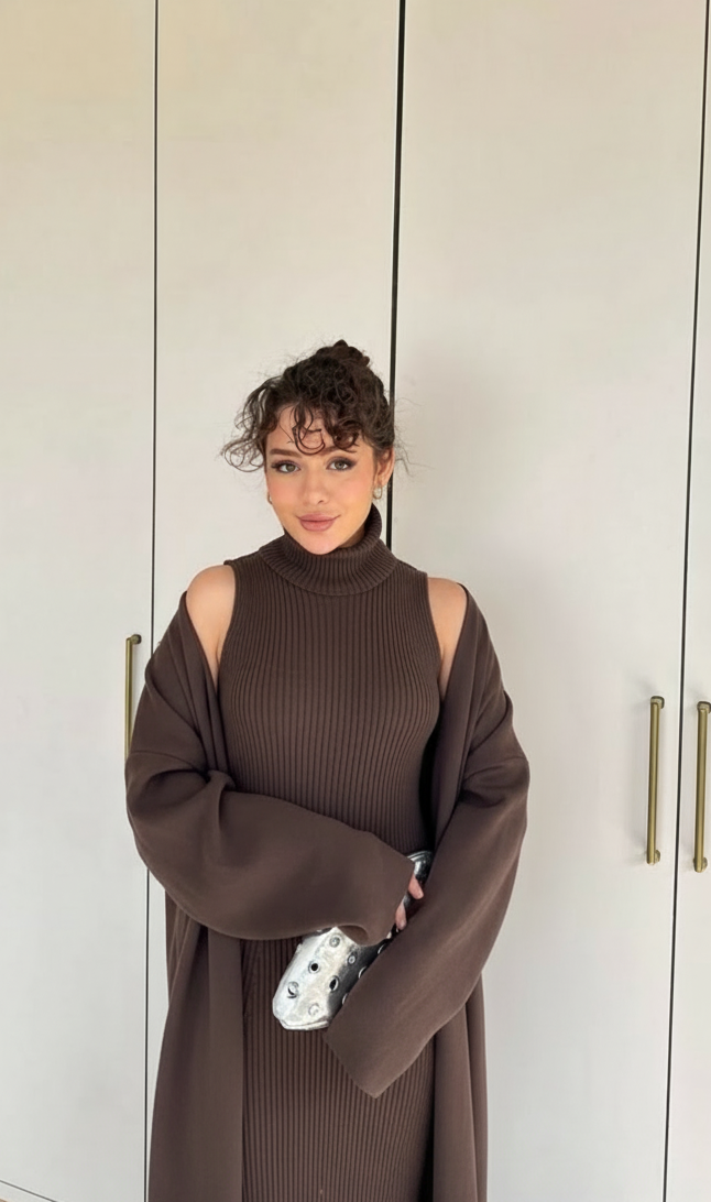 Sleeveless dress with a long cardigan from the same color. You can wear it as a set or style it the way you want.