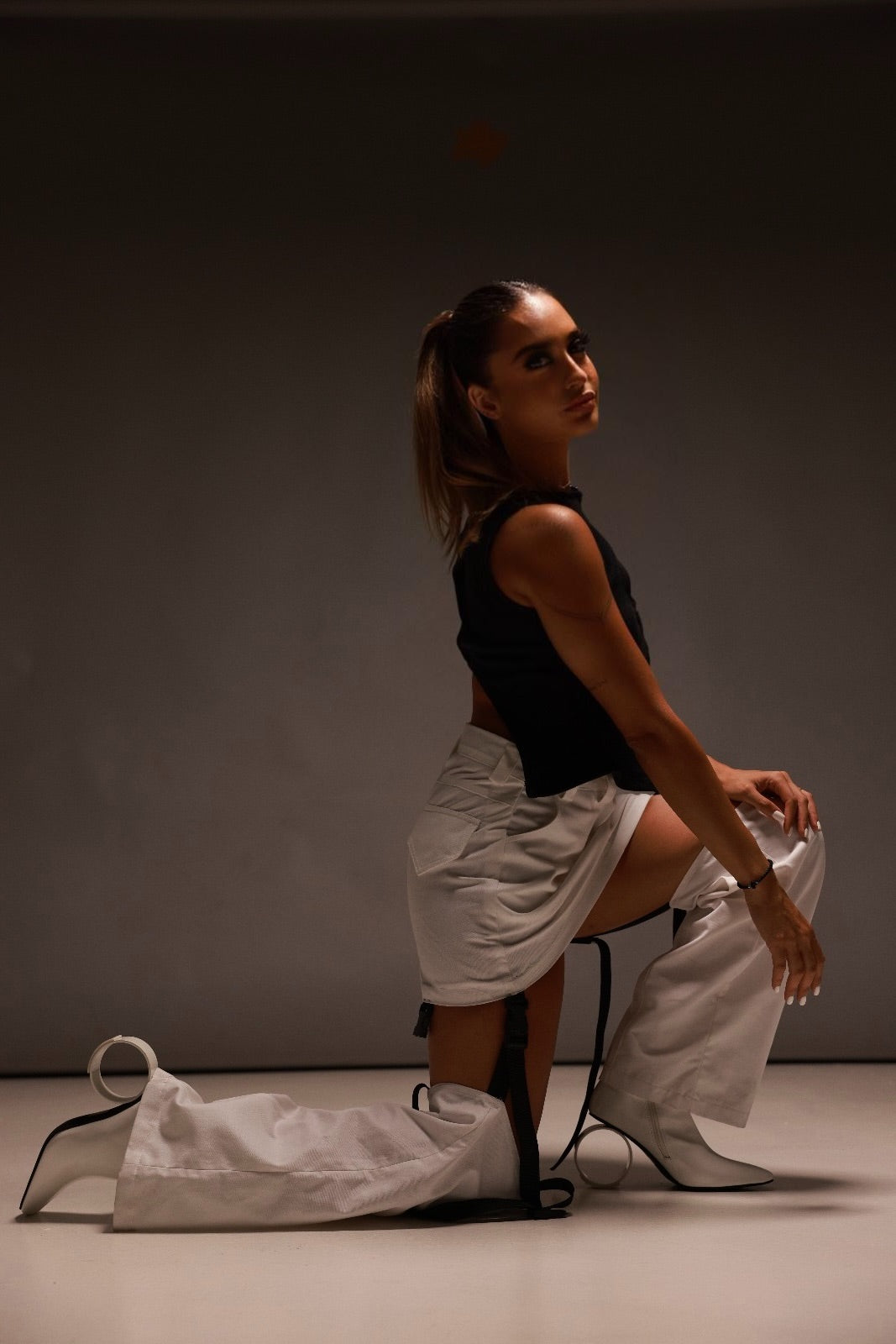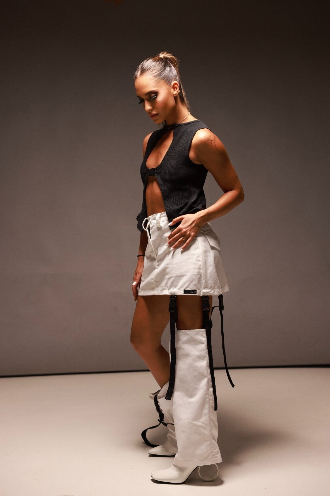 Gabardine skirt completed with boots cover fron the same fabric, attached together with @studio10.14 famous buckles.