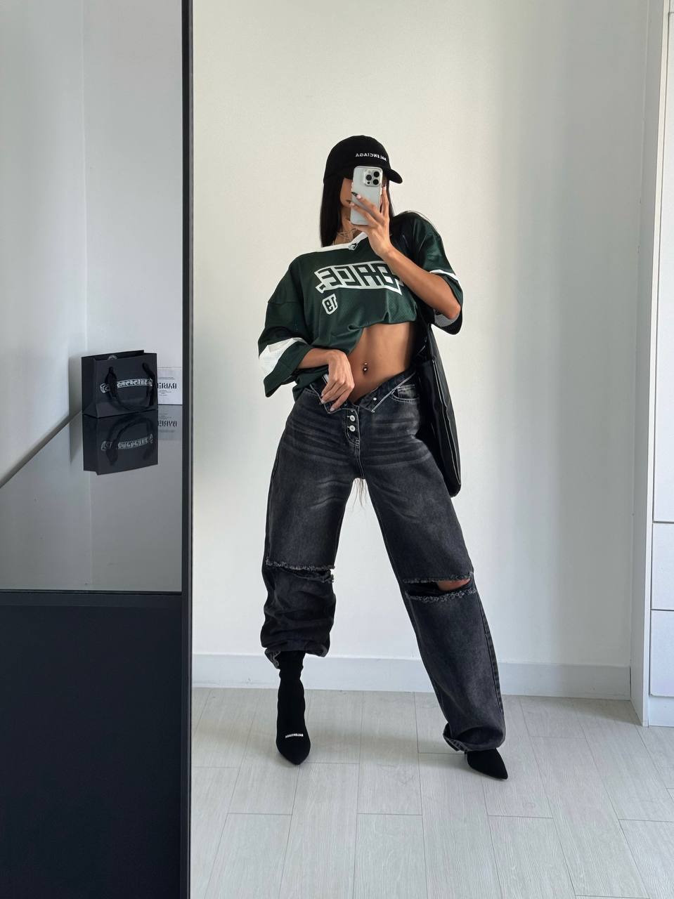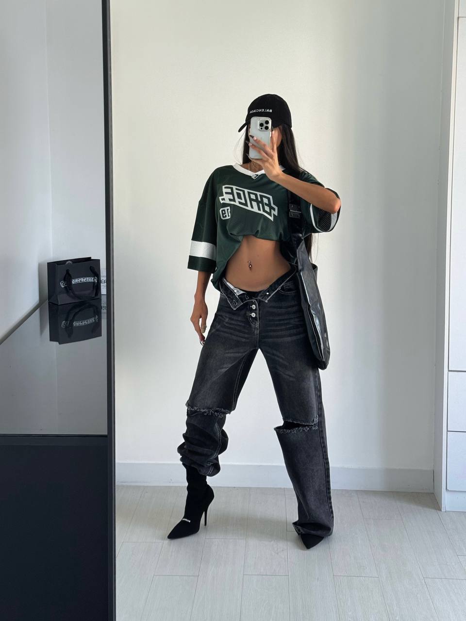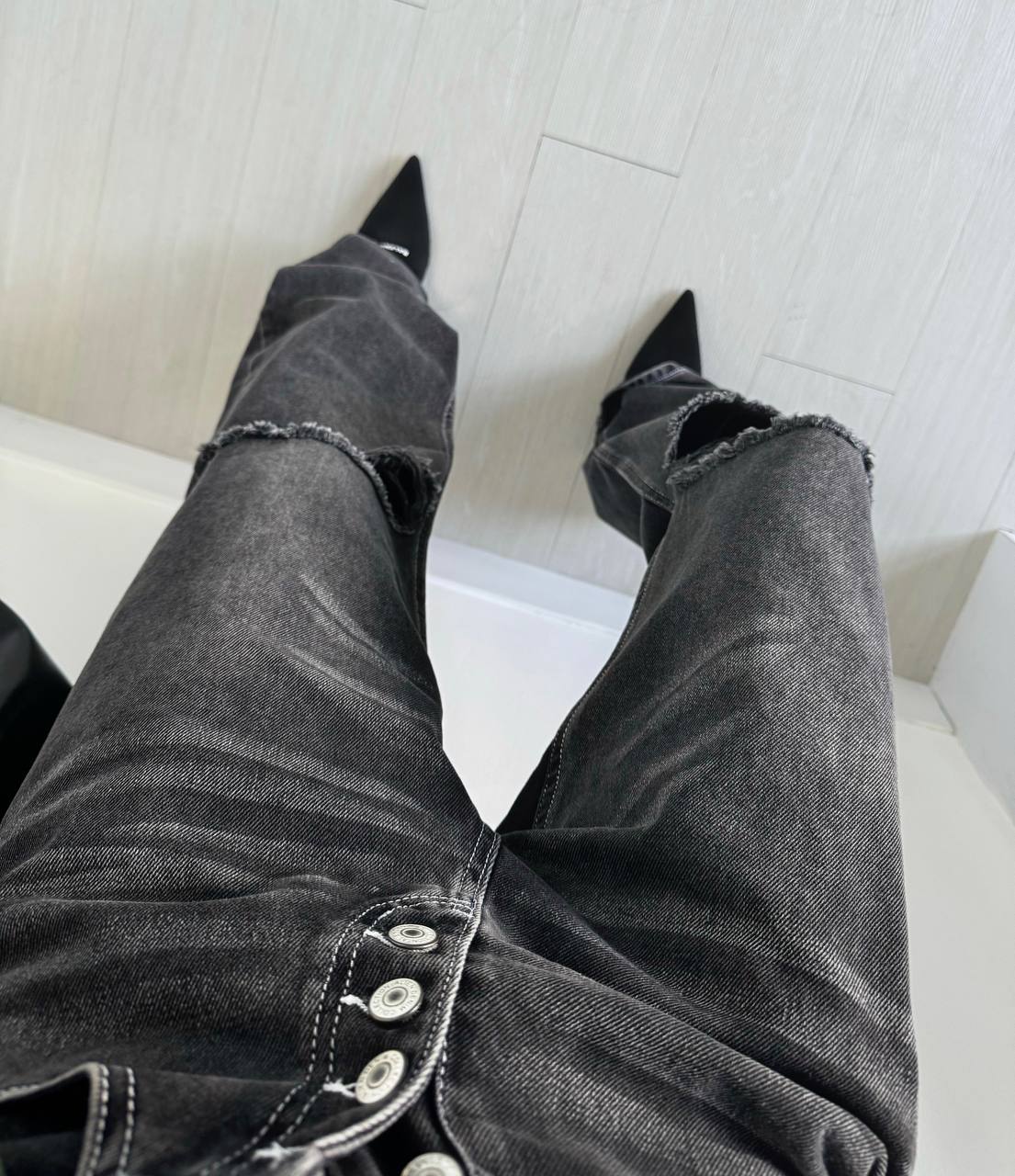 The classic buttoned denim features a high waist design, paired with a dark gray wash and flare denim. This stylish combination offers a flattering fit for any body type, a perfect blend of comfort and style.