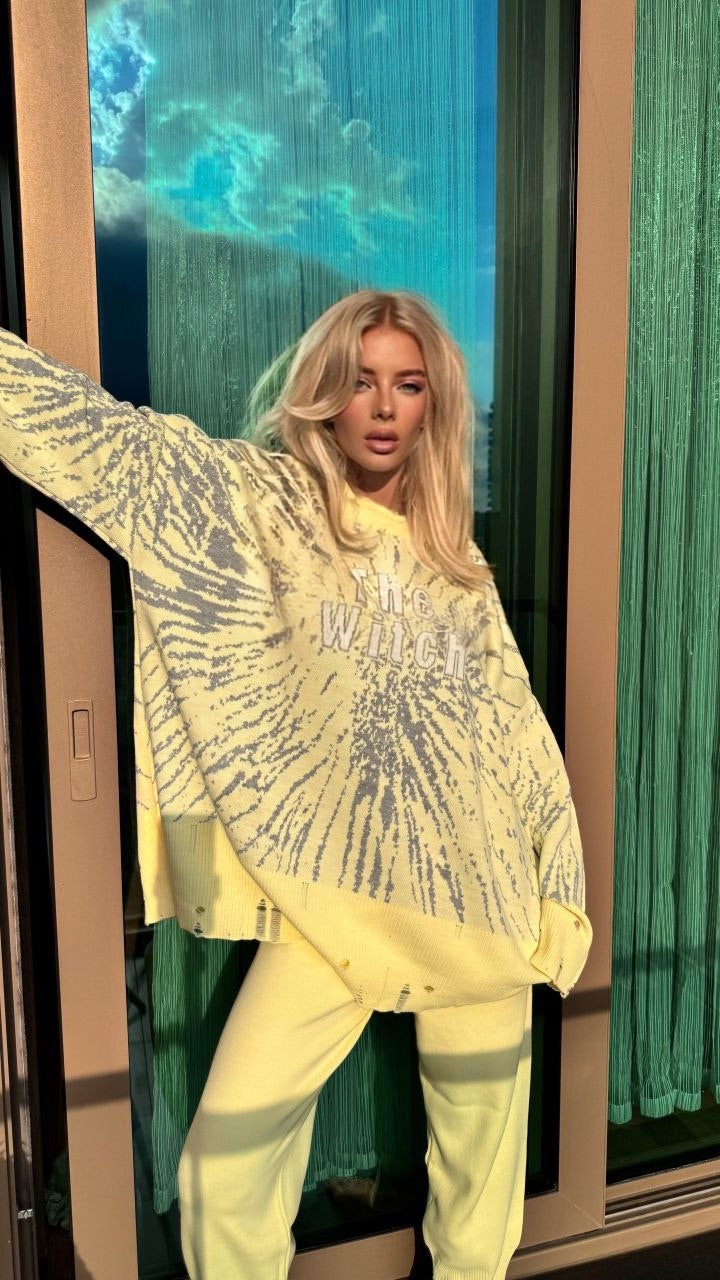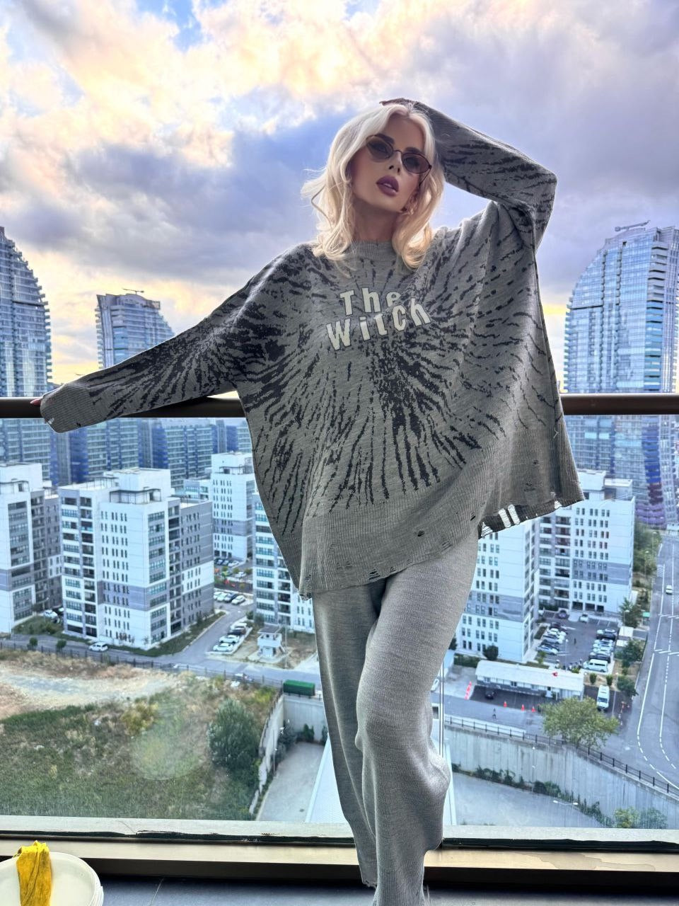 As you see in the photos, sweat is oversized, long length with wide sleeves are shown.